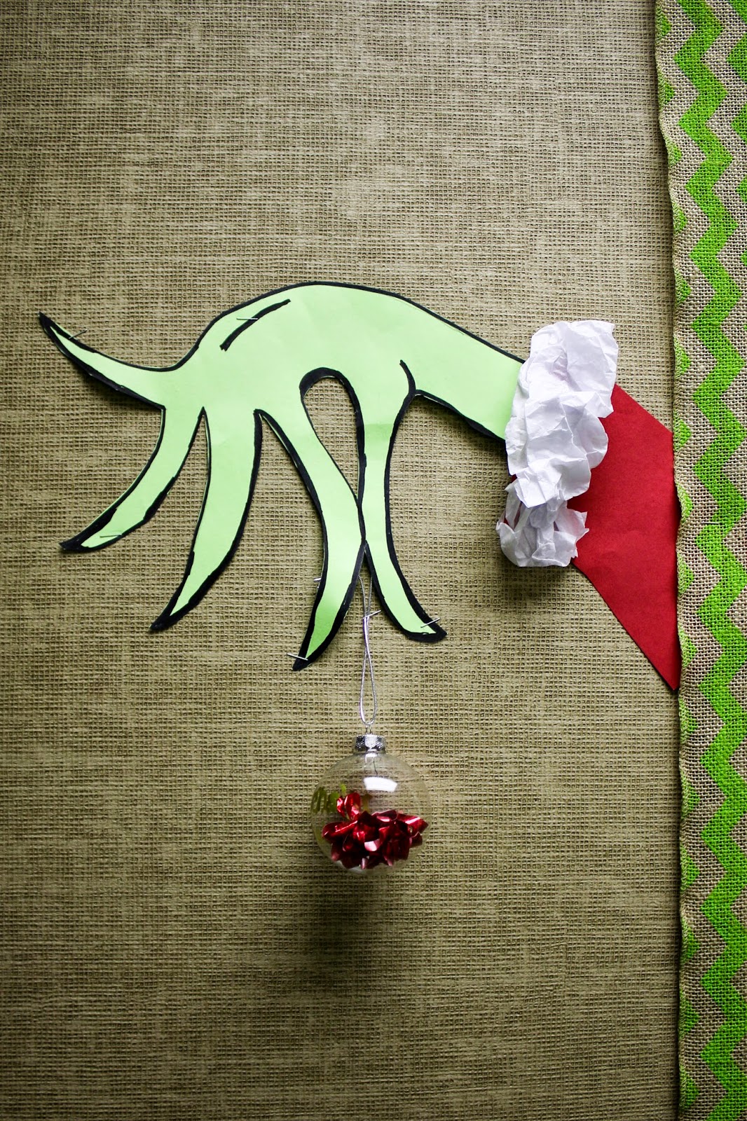 Five fingers holding a decoration is all that’s needed to say, It’s Christmas, Dr. Seuss! Every kid in the school will recognize those fingers, and the white frilled cuff and red jacket belong to a Santa.
